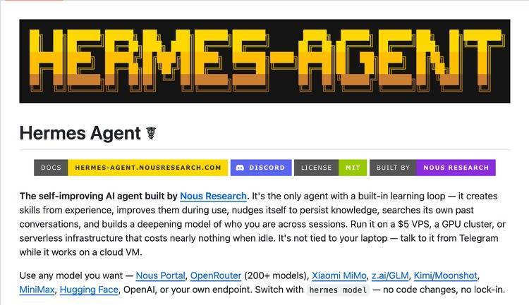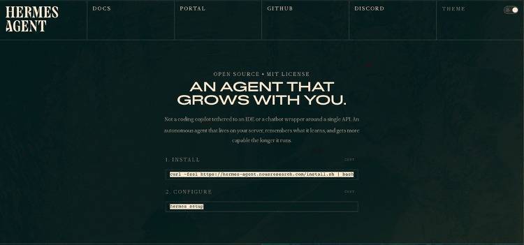据了解,Hermes Agent核心定位是一款“会自我进化”的AI智能体。它的口号很直白:“the agent that grows with you”——与你一同成长的Agent。